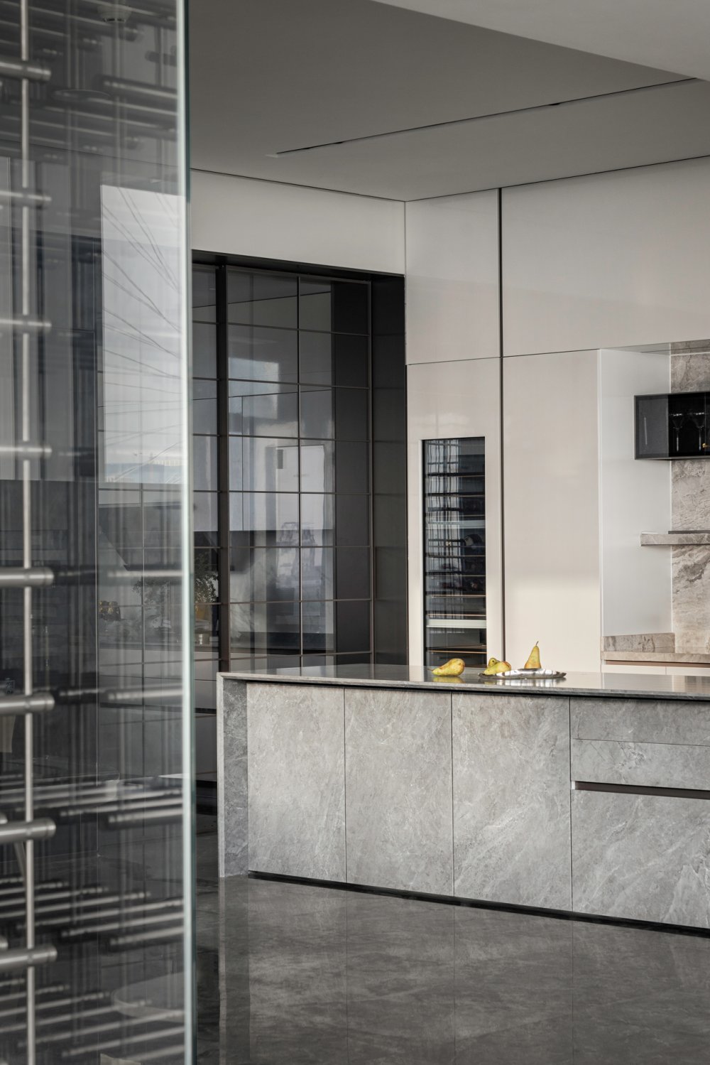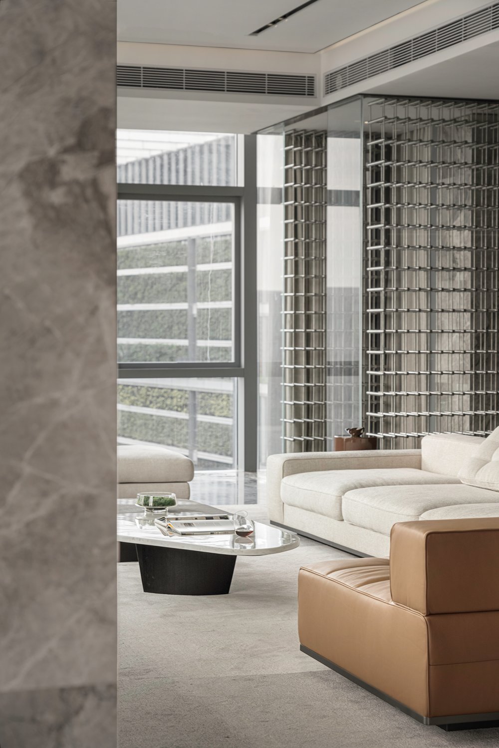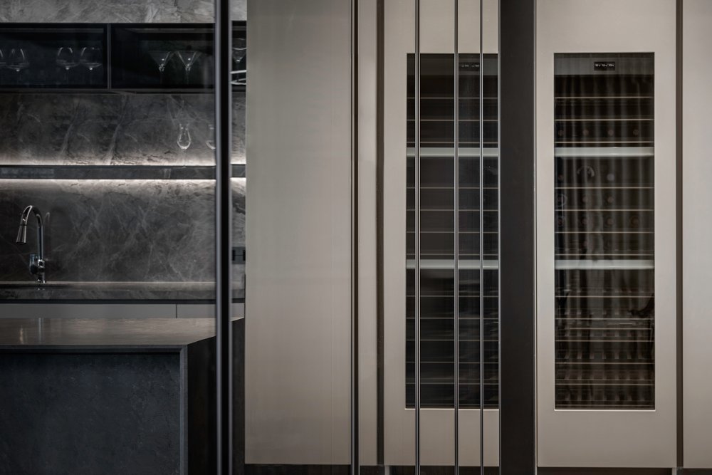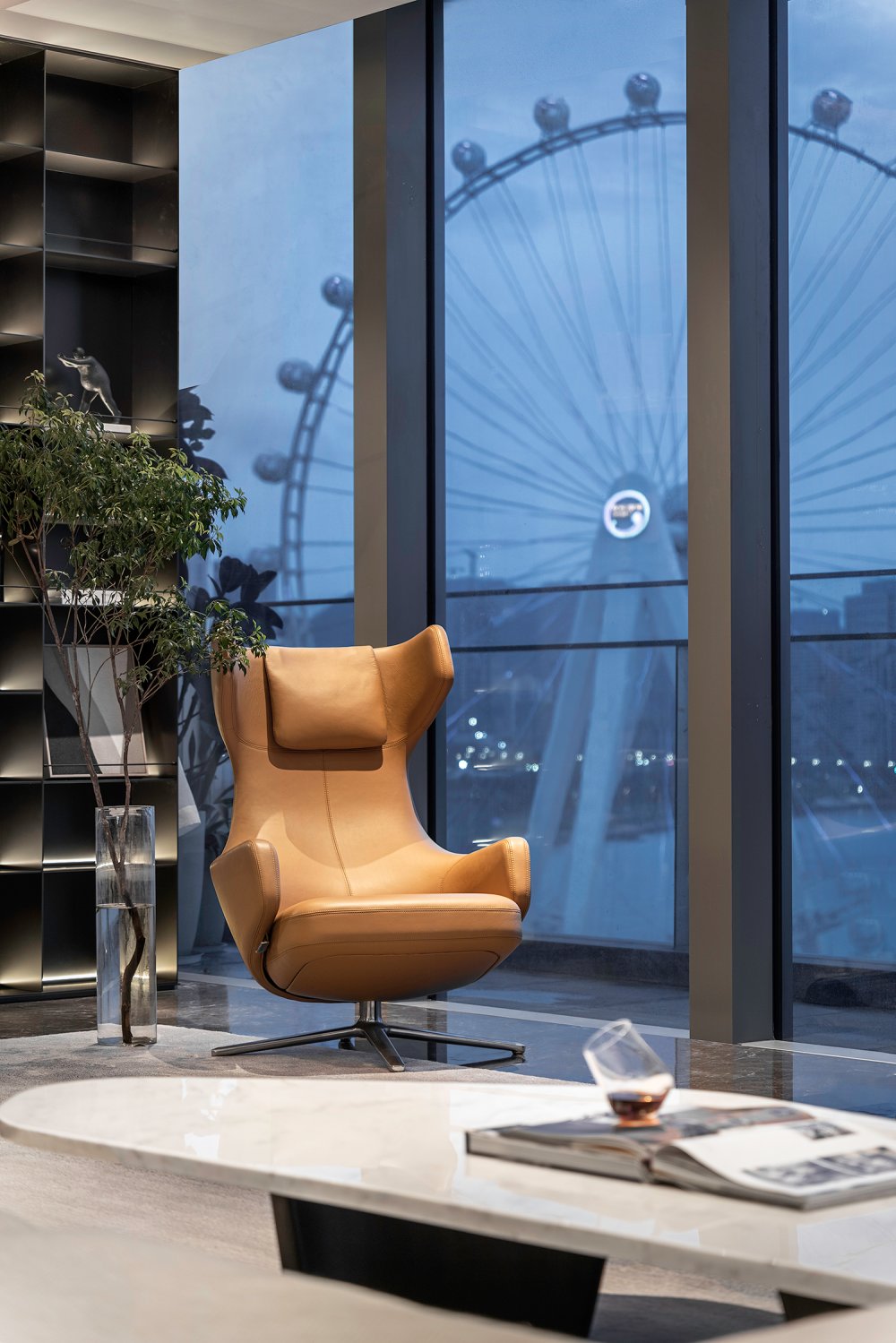 內(nèi)建筑式手法打造的觀景休息廳,高級(jí)灰調(diào)馬鞍皮柜體,朦朧玻璃材質(zhì)電動(dòng)門,以及閃耀金屬光澤的酒架......成為隨處可見、精心設(shè)置的巧思與細(xì)節(jié)。