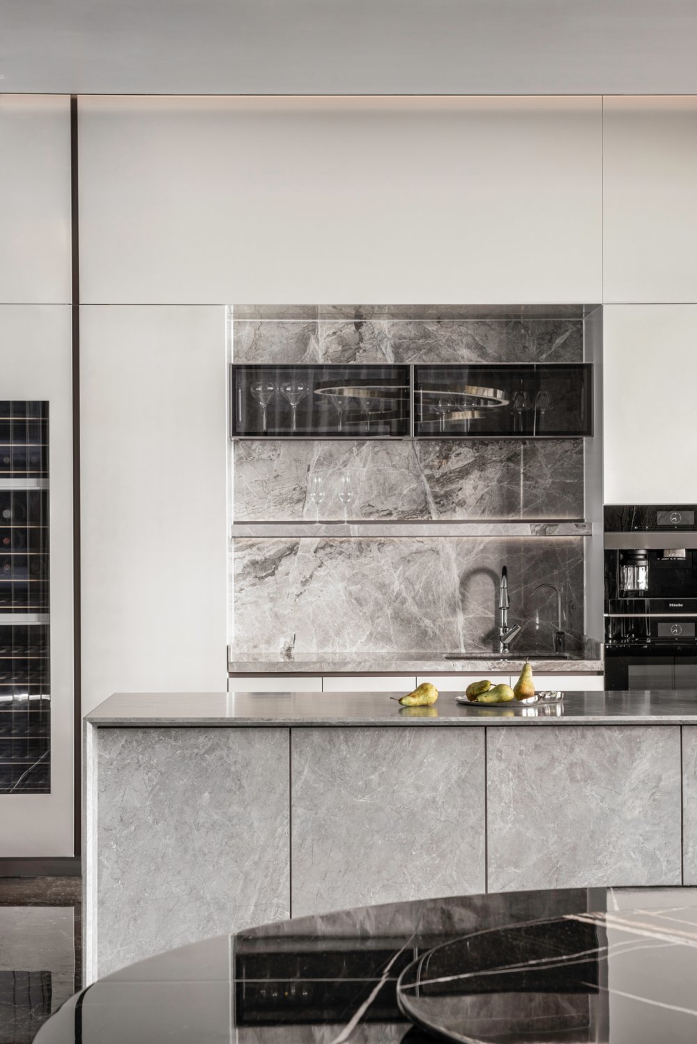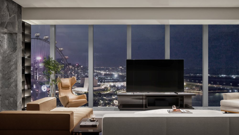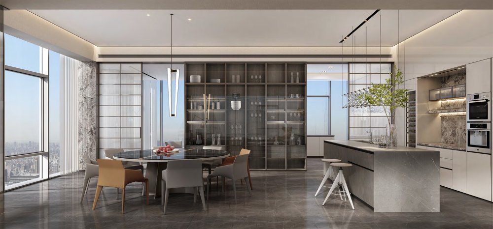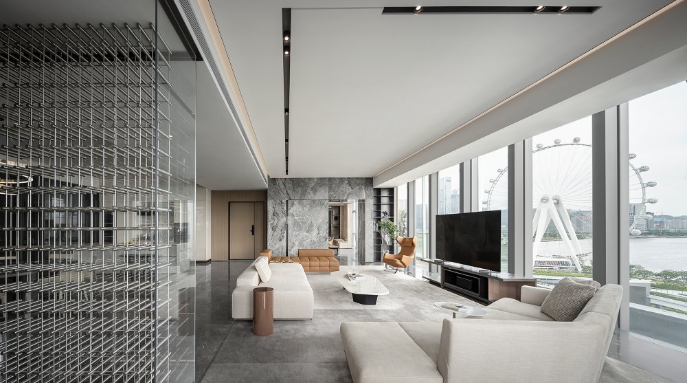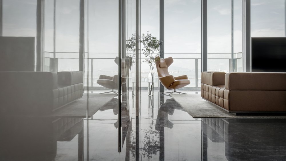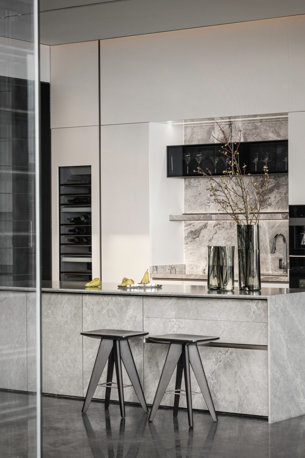 內(nèi)建筑式手法打造的觀景休息廳,高級(jí)灰調(diào)馬鞍皮柜體,朦朧玻璃材質(zhì)電動(dòng)門,以及閃耀金屬光澤的酒架......成為隨處可見、精心設(shè)置的巧思與細(xì)節(jié)。