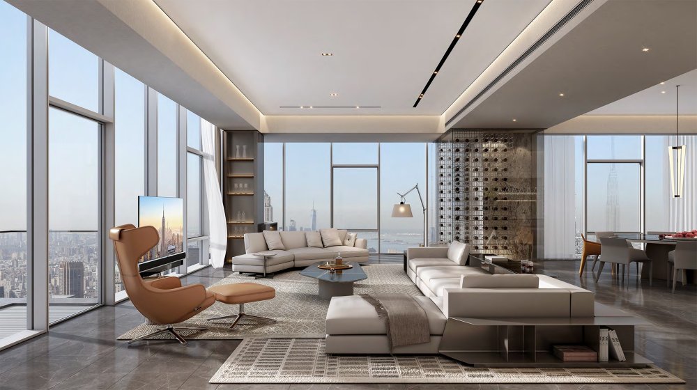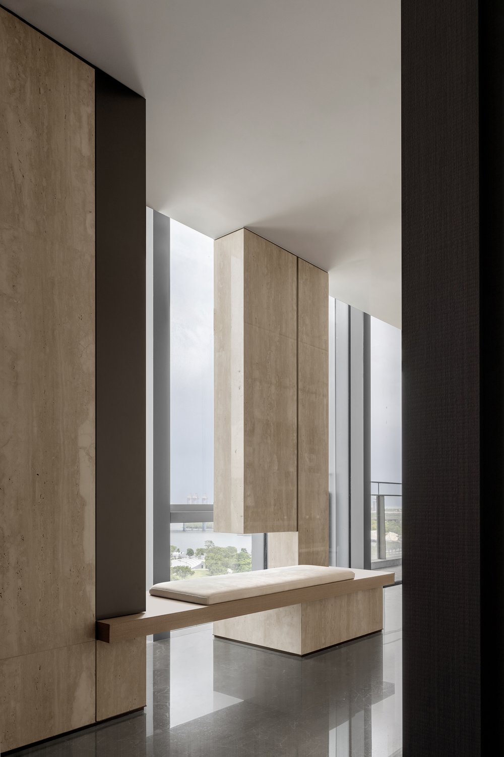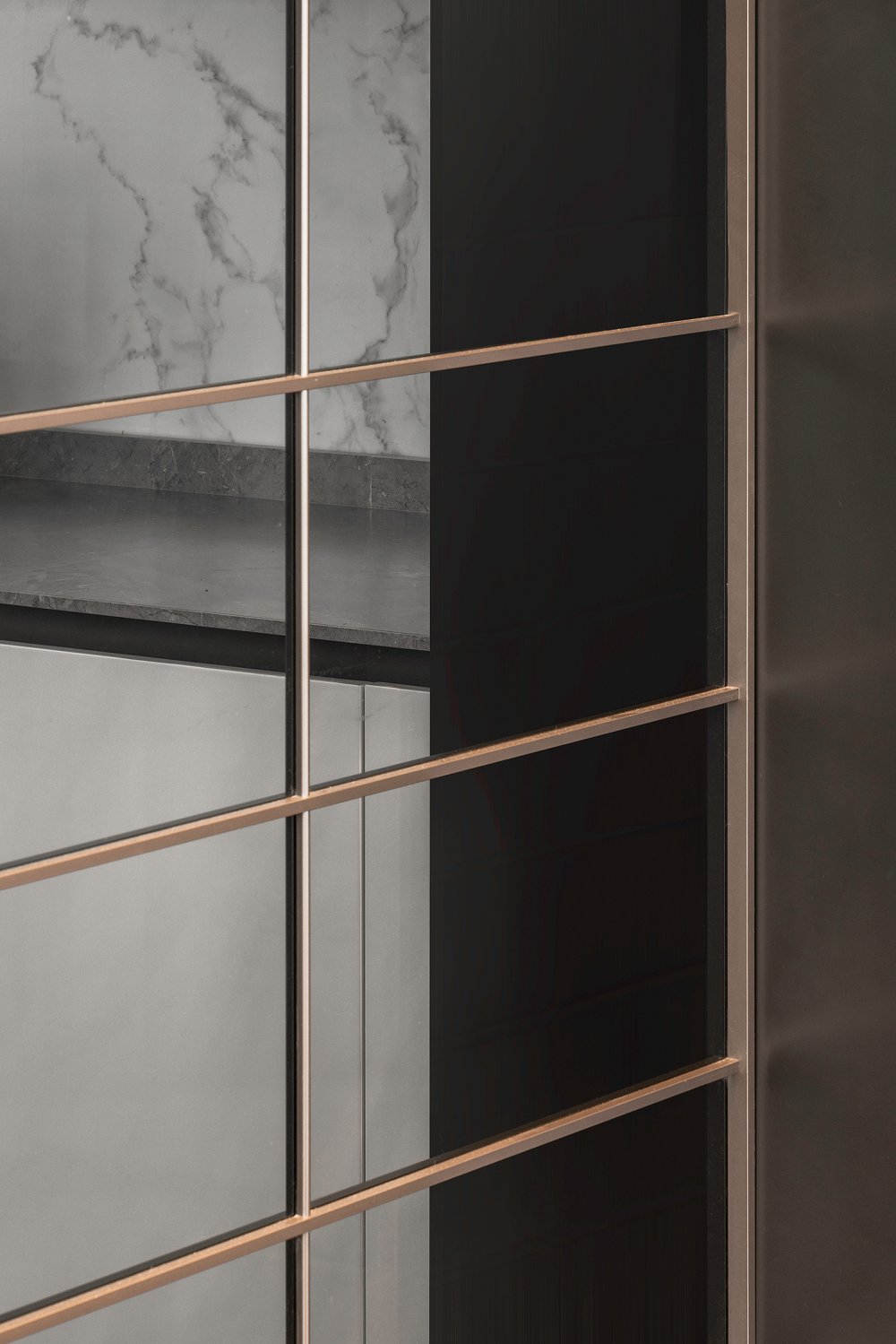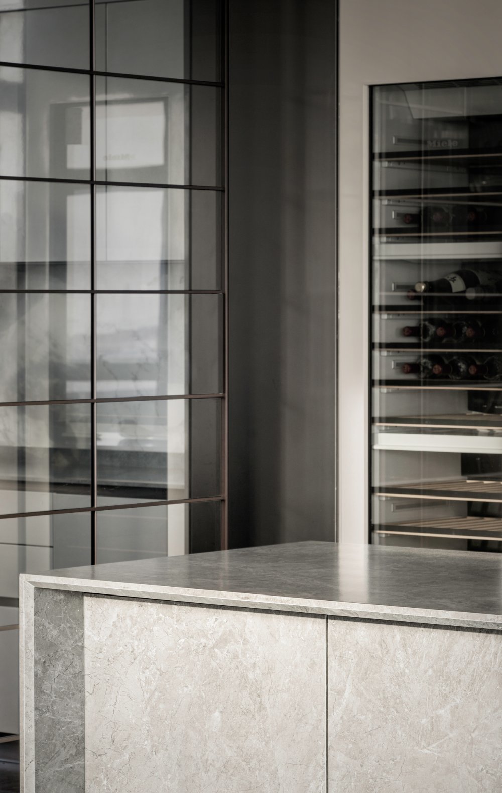 內(nèi)建筑式手法打造的觀景休息廳,高級(jí)灰調(diào)馬鞍皮柜體,朦朧玻璃材質(zhì)電動(dòng)門,以及閃耀金屬光澤的酒架......成為隨處可見、精心設(shè)置的巧思與細(xì)節(jié)。