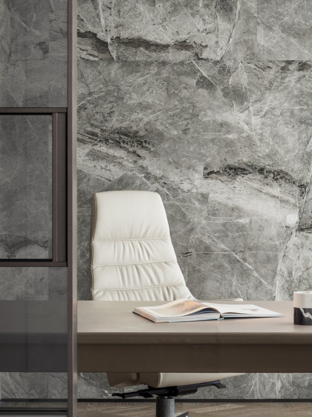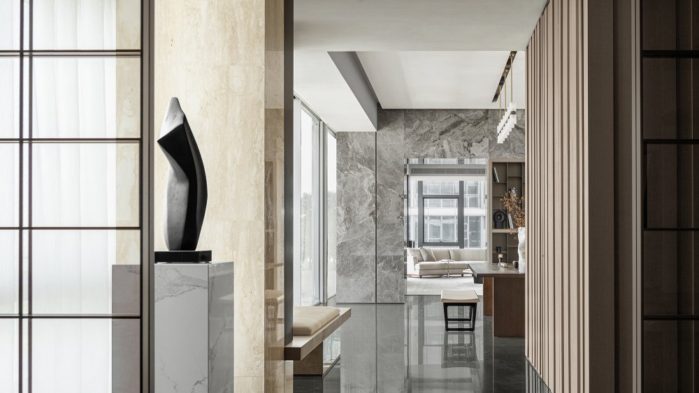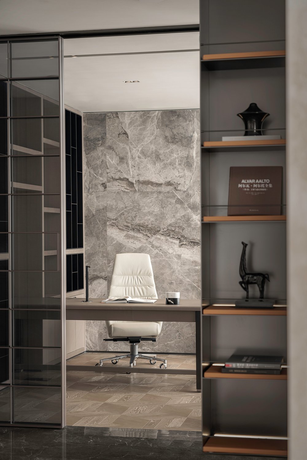 • 主要材料|慕色灰大理石、水波紋大理石、陶瓷薄板、金屬網(wǎng)、夾絲玻璃、鋸痕紋木飾面、編織皮革、實(shí)木復(fù)合地板