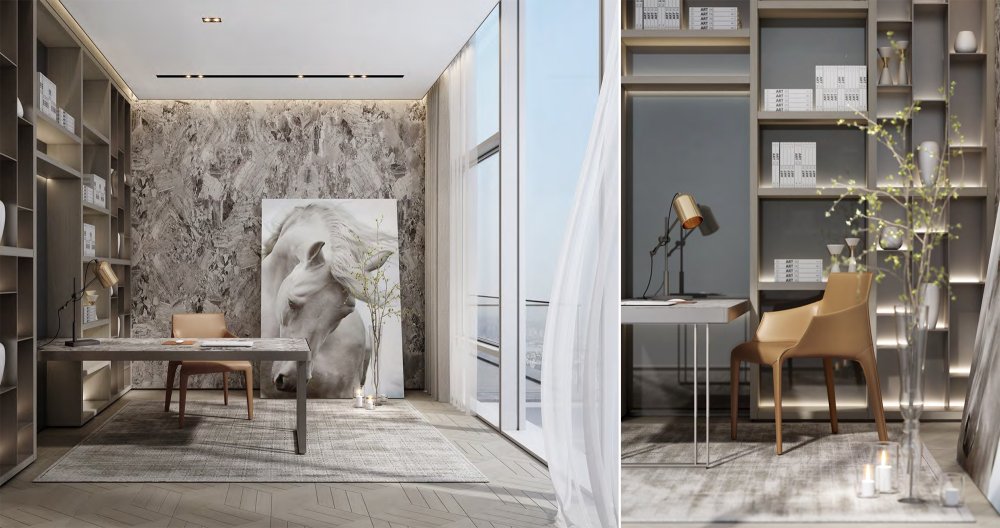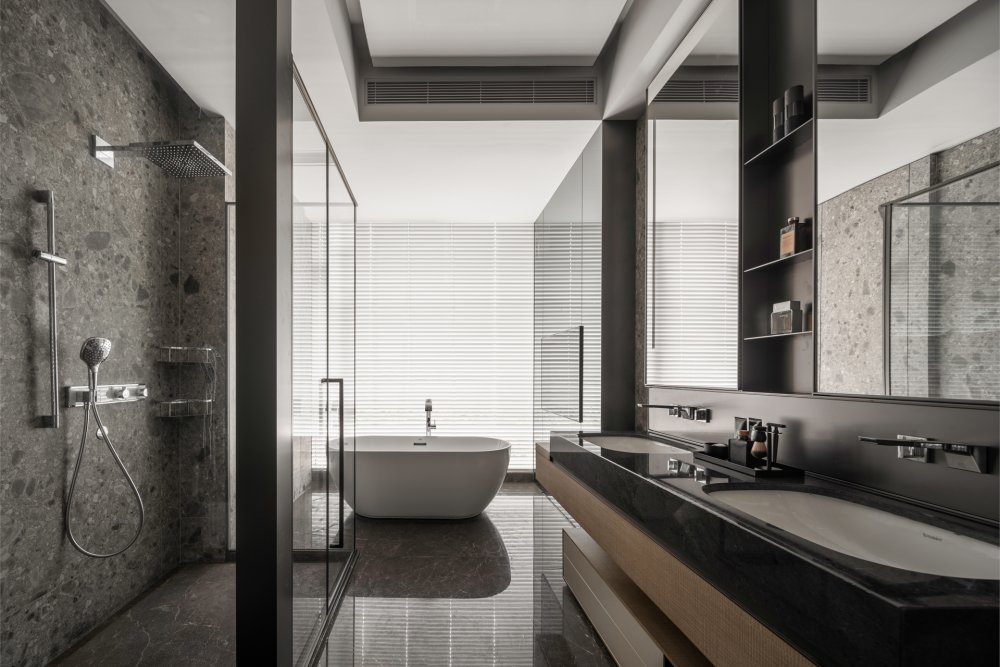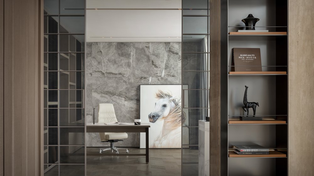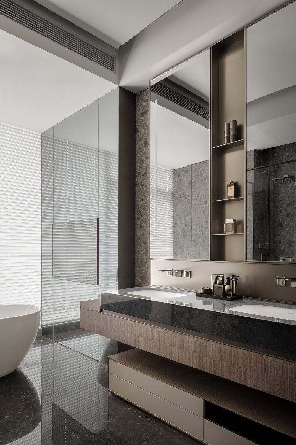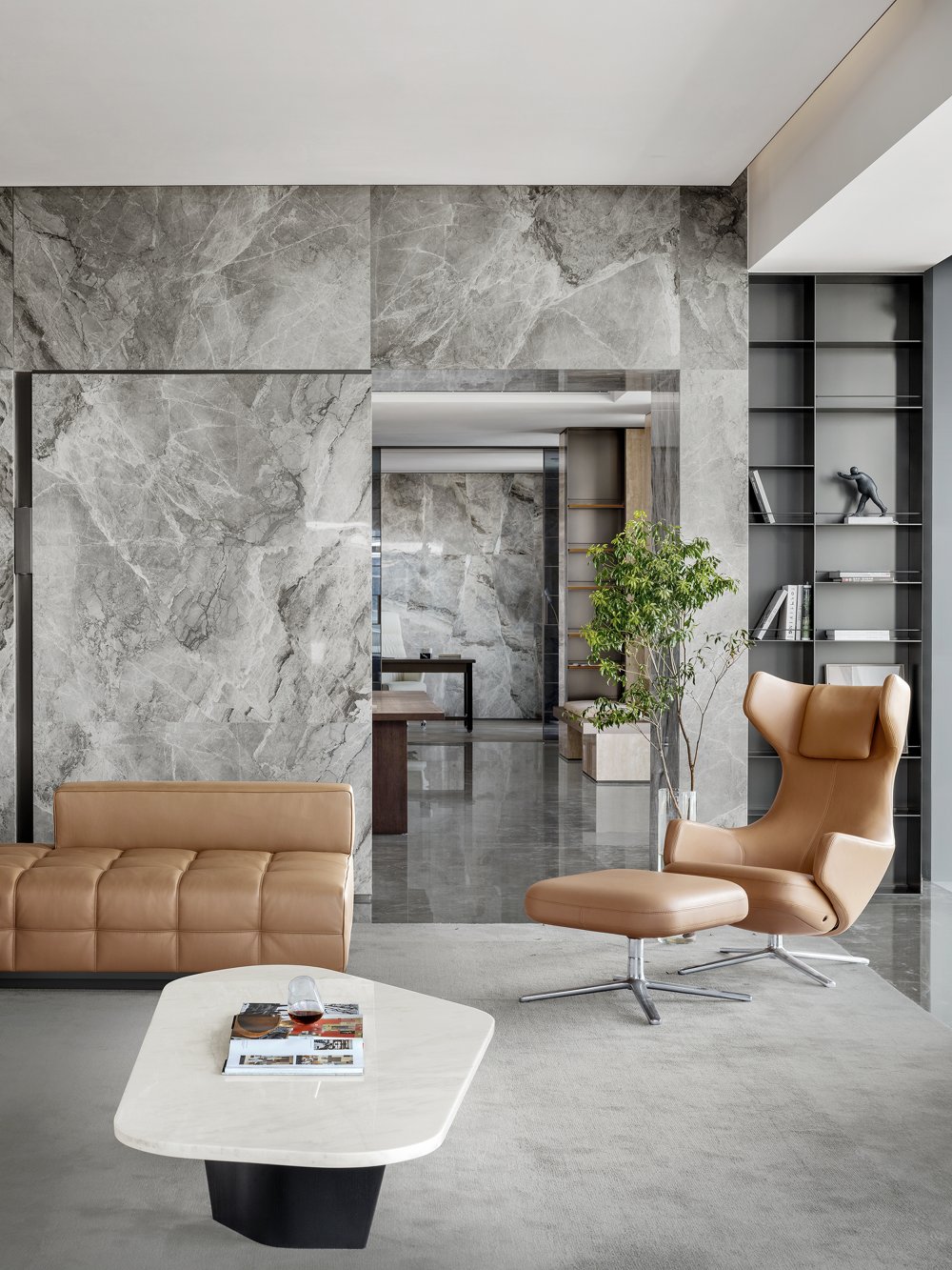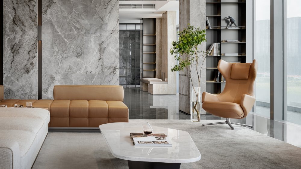 • 以硬朗的黑色石材,棕色皮質(zhì),鏡面,金屬等材質(zhì)和肌理感修飾出近乎相似的高級(jí)品格。