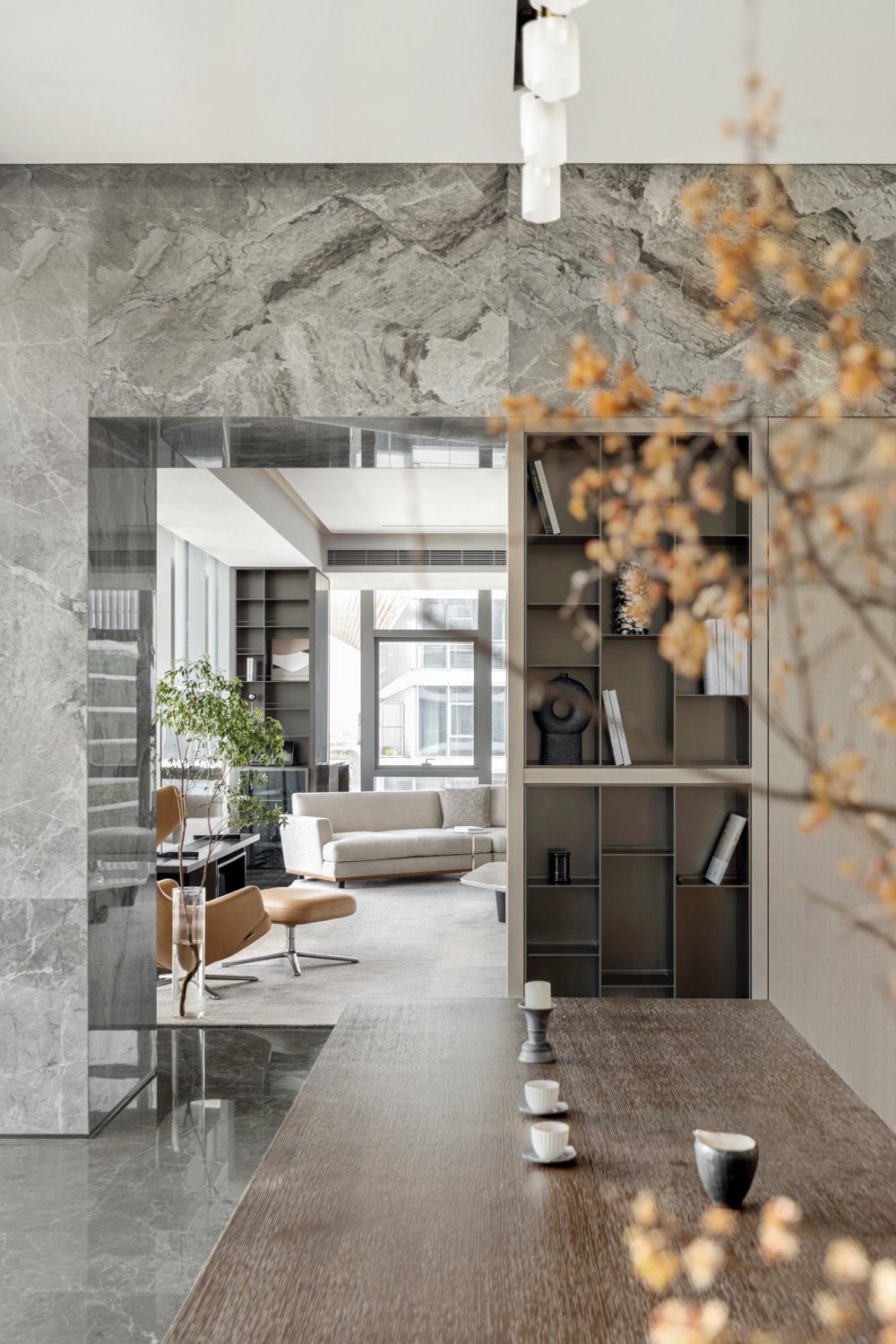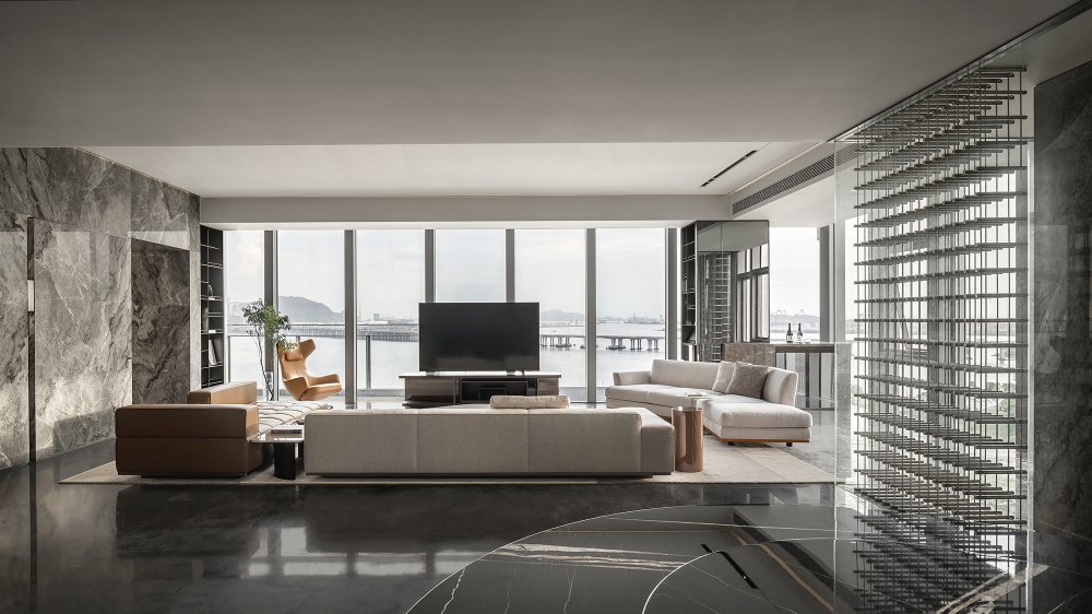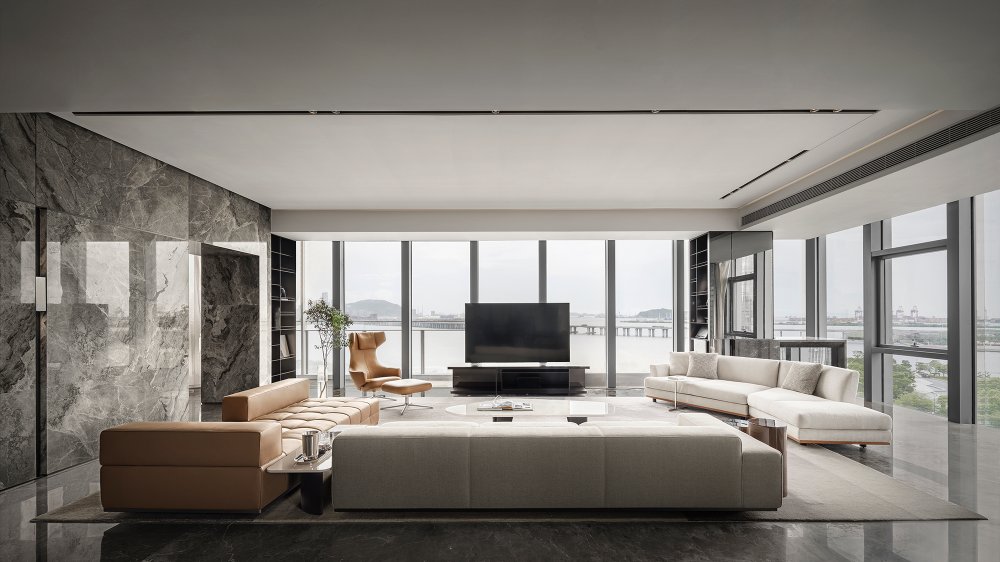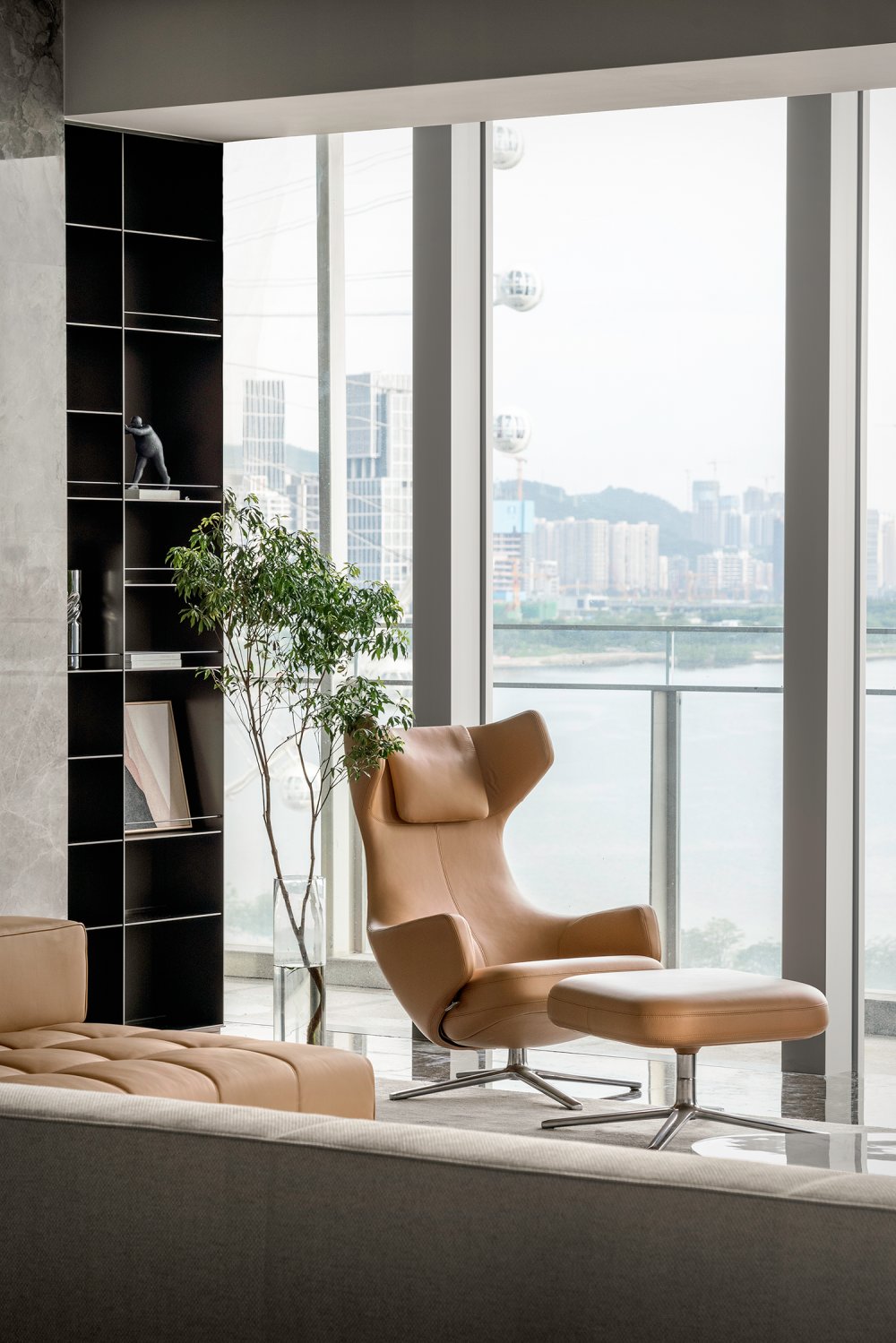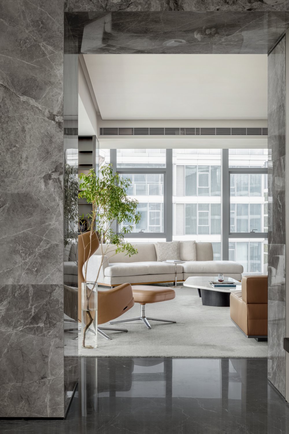 • 有別于窗外景色的豐富飽滿,會(huì)客廳用不同程度色調(diào)的白、棕、灰表達(dá)著愈發(fā)沉靜的內(nèi)斂。