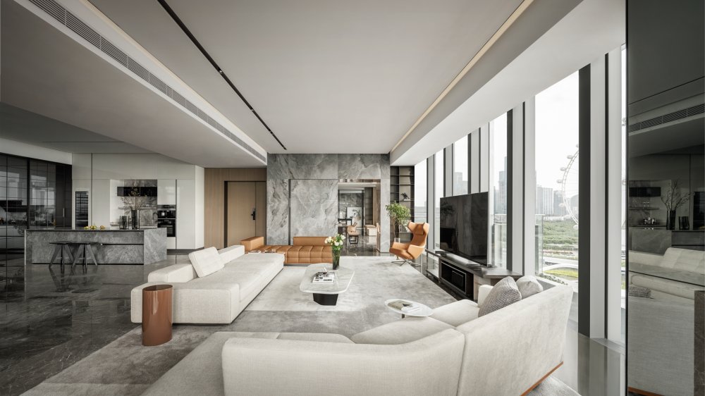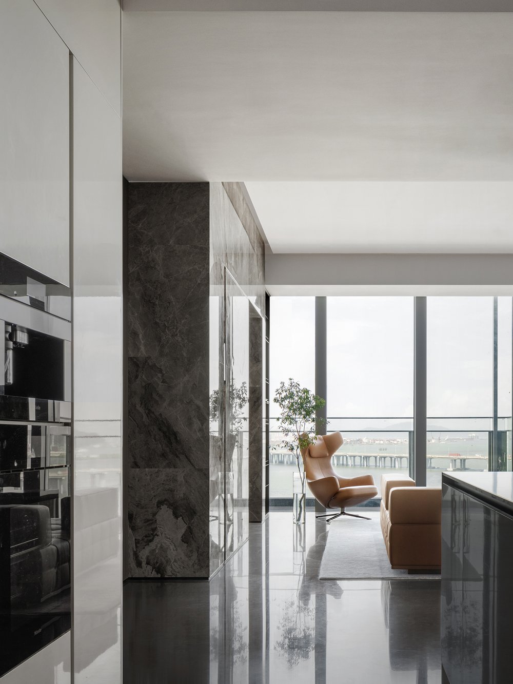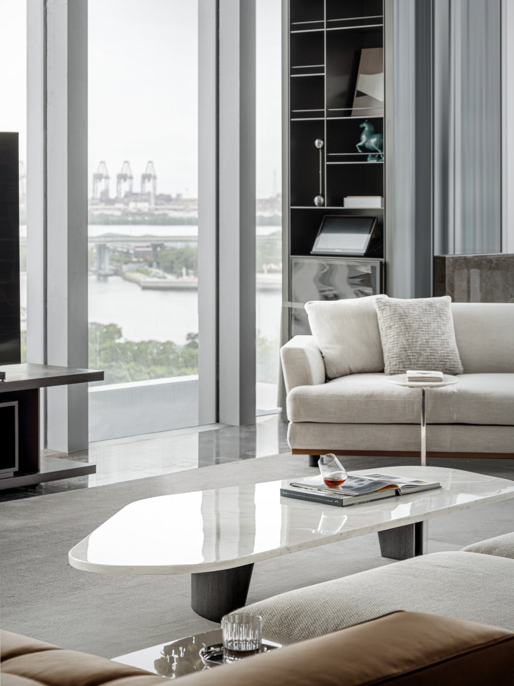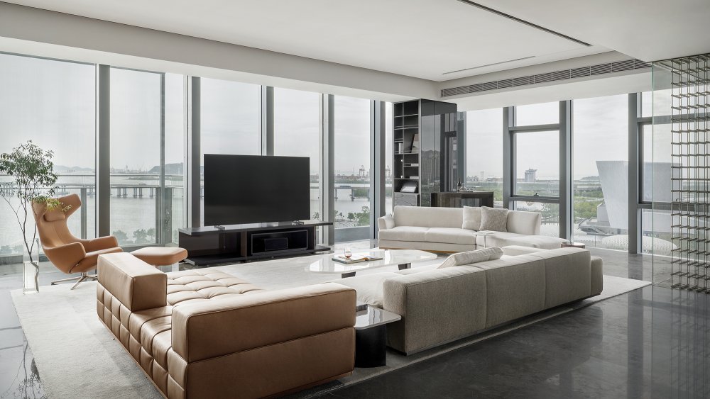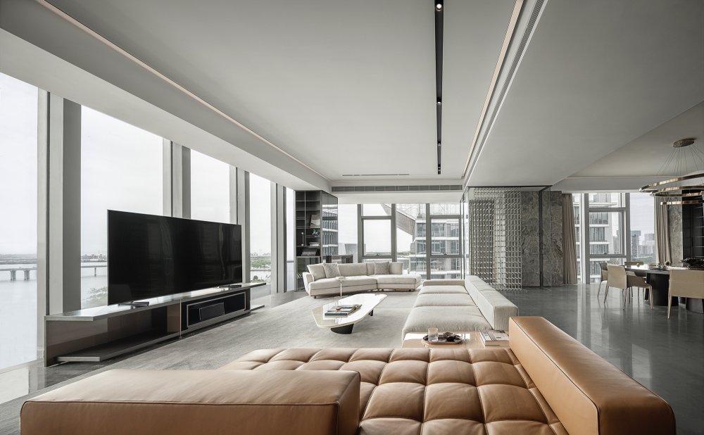 • 有別于窗外景色的豐富飽滿,會(huì)客廳用不同程度色調(diào)的白、棕、灰表達(dá)著愈發(fā)沉靜的內(nèi)斂。